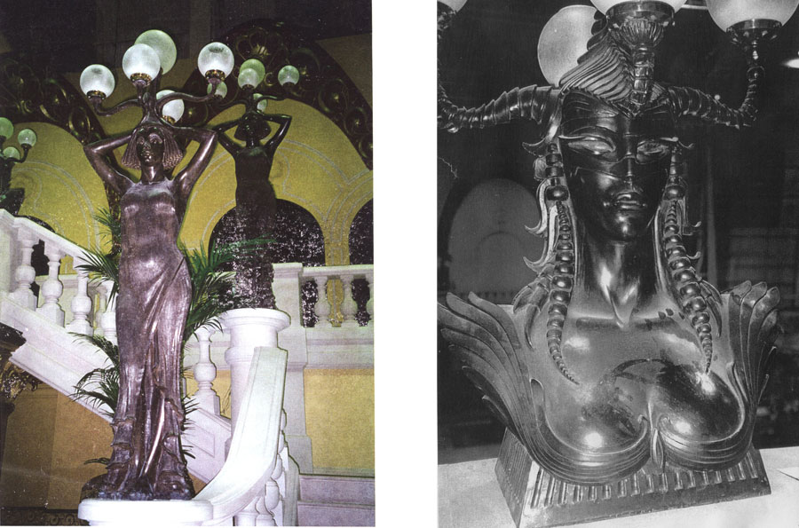 Female statues, cast into repeats and used to decorate the great hall as ornate lighting pieces | sculpted in clay and cast into fibreglass