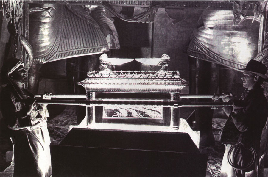 The Ark of the Covenant | Two winged angels and side panels depicting the 'swirling firmament' | Modelled in clay and cast into fibreglass | On set at Elstree Studios |